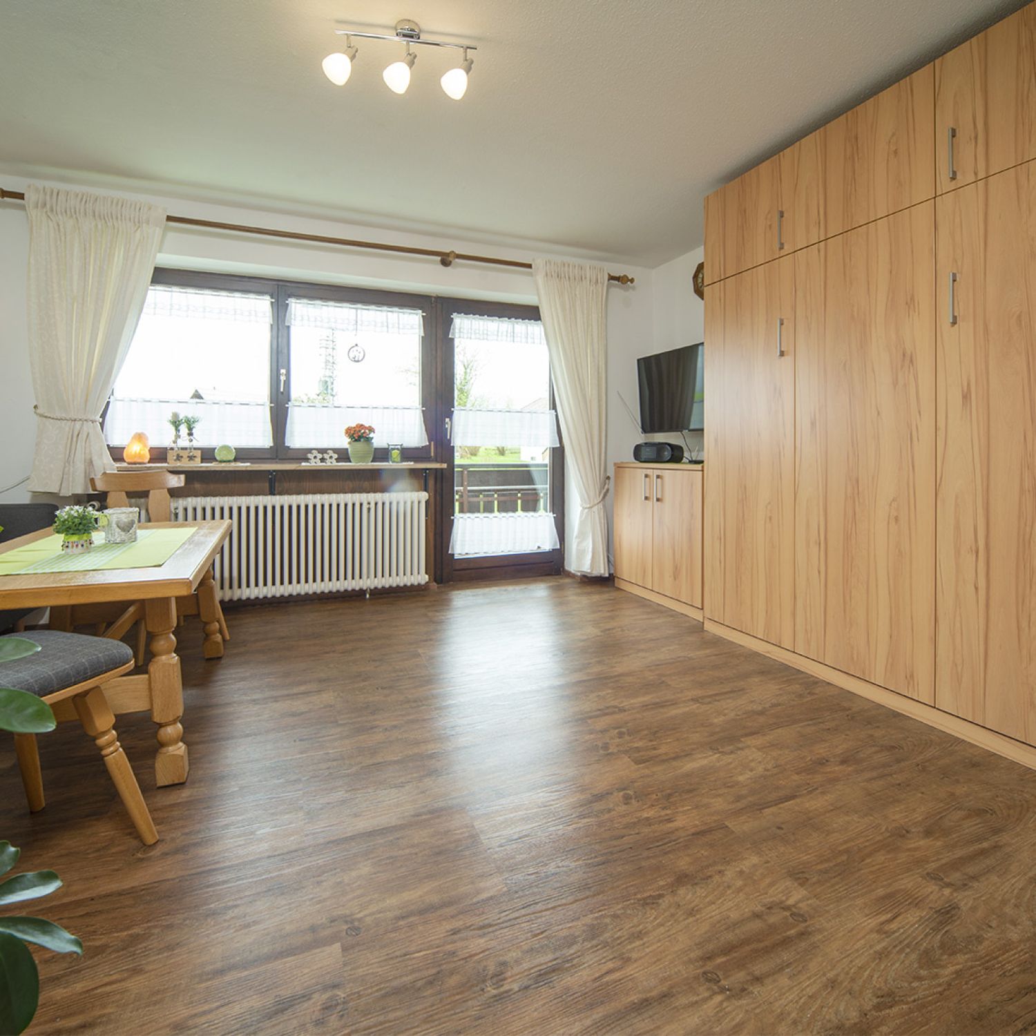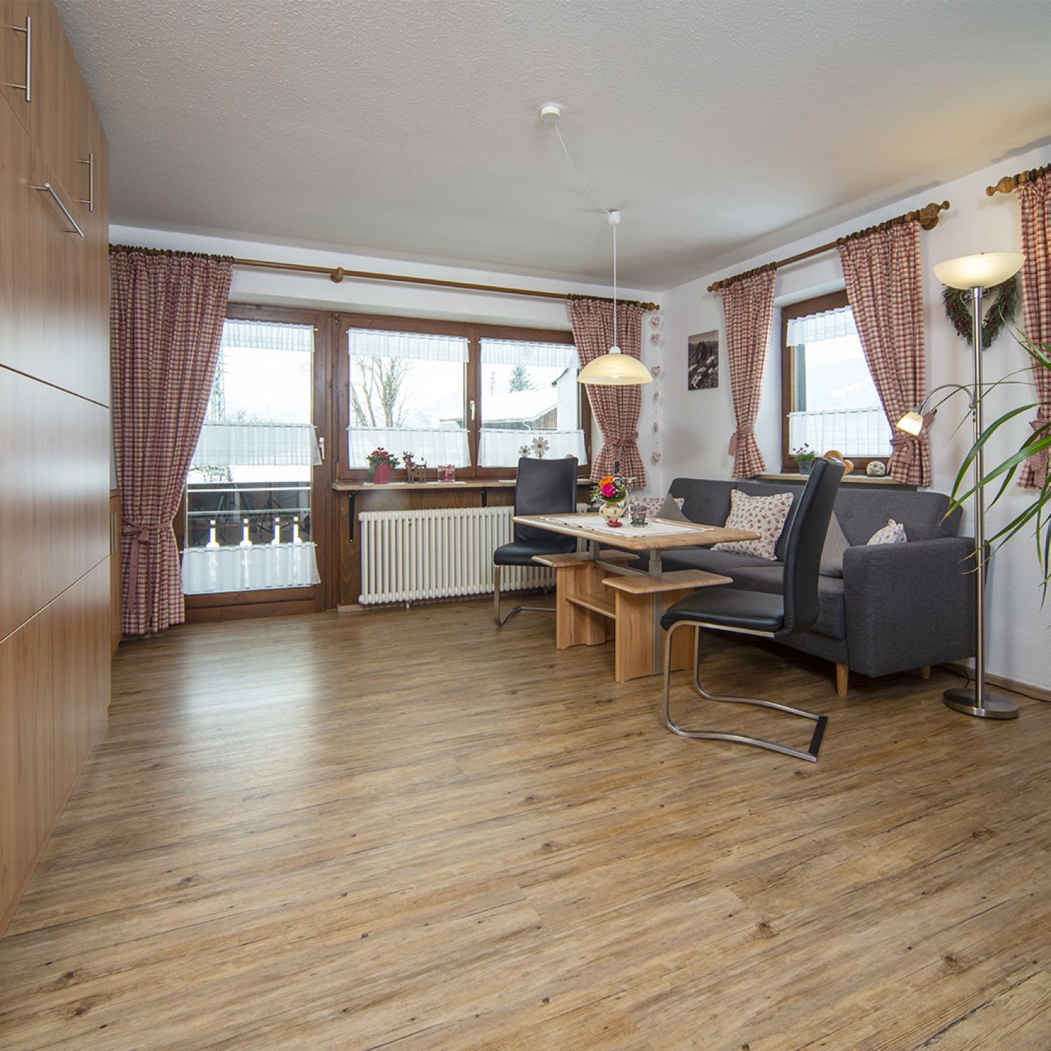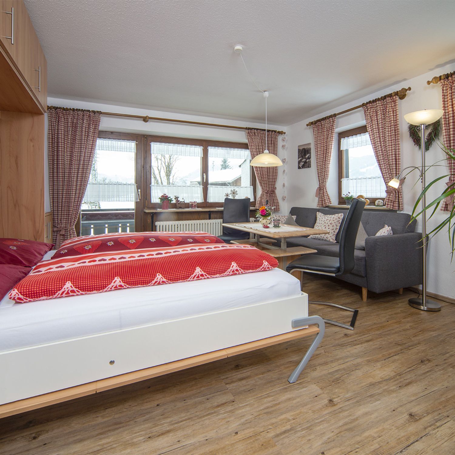 Auch in der Ferienwohnung Sonnenkopf lässt sich im Wohnraum mit weingen Handgriffen ein hochwertiges Doppelbett dazu zaubern. Und tagsüber ist es platzsparend im Wandschrank versteckt.